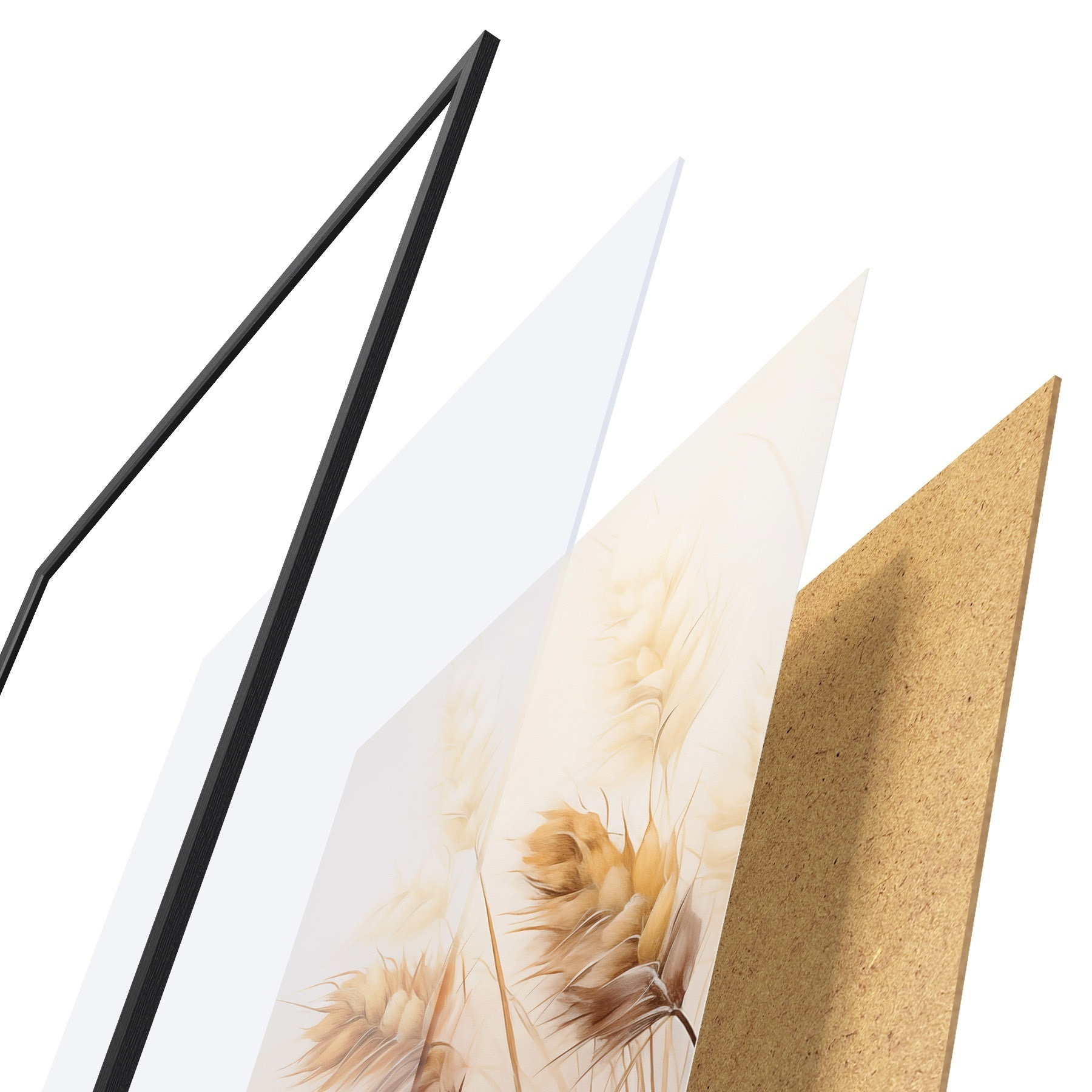 Plagát sa skladá z rámu, plexiskla, vytlačeného obrazu a podkladu z drevotriesky. Plagát možno okamžite zavesiť na stenu vďaka úchytom na zadnej strane.