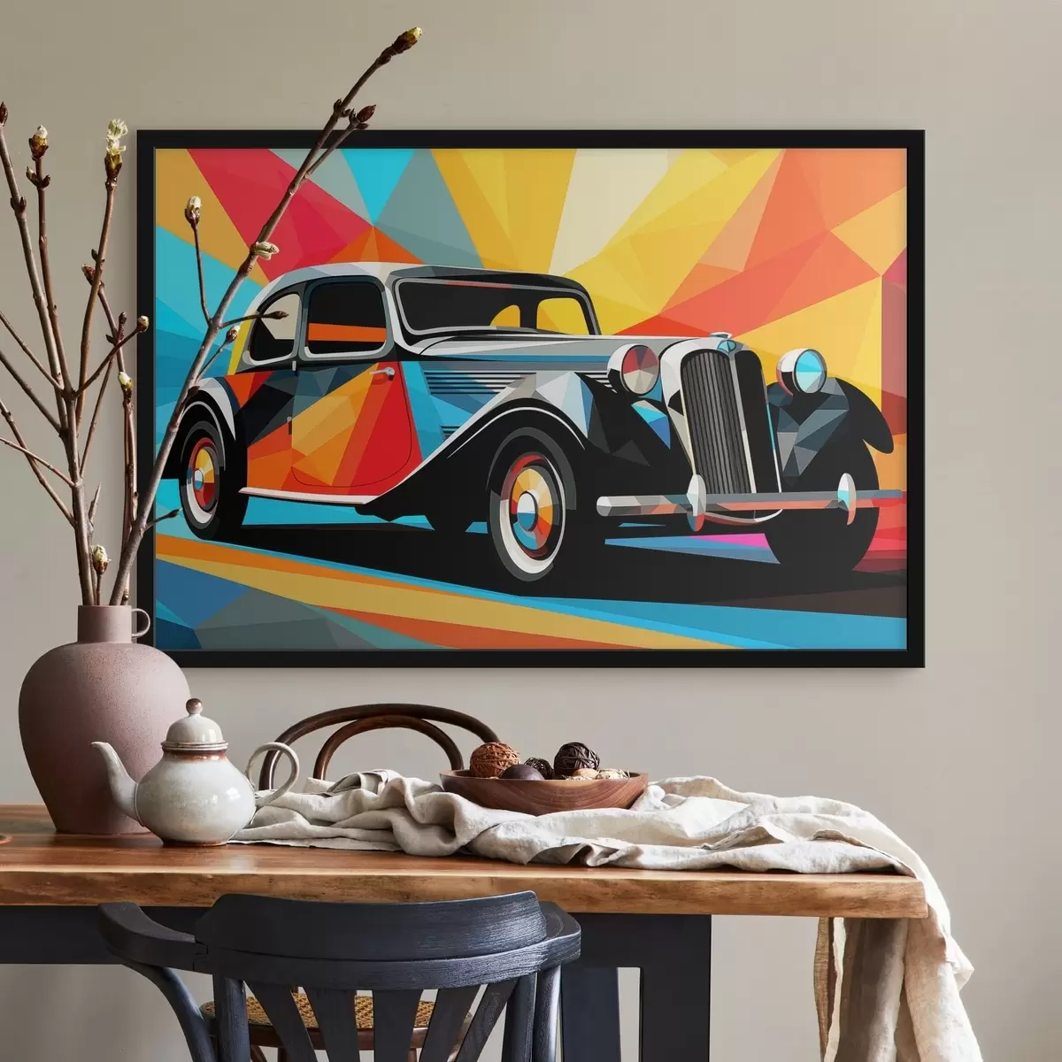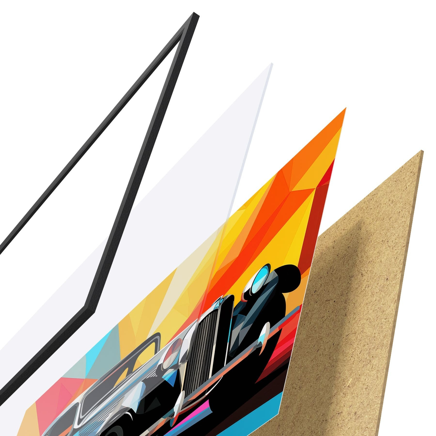 Plagát sa skladá z rámu, plexiskla, vytlačeného obrazu a podkladu z drevotriesky. Plagát možno okamžite zavesiť na stenu vďaka úchytom na zadnej strane.