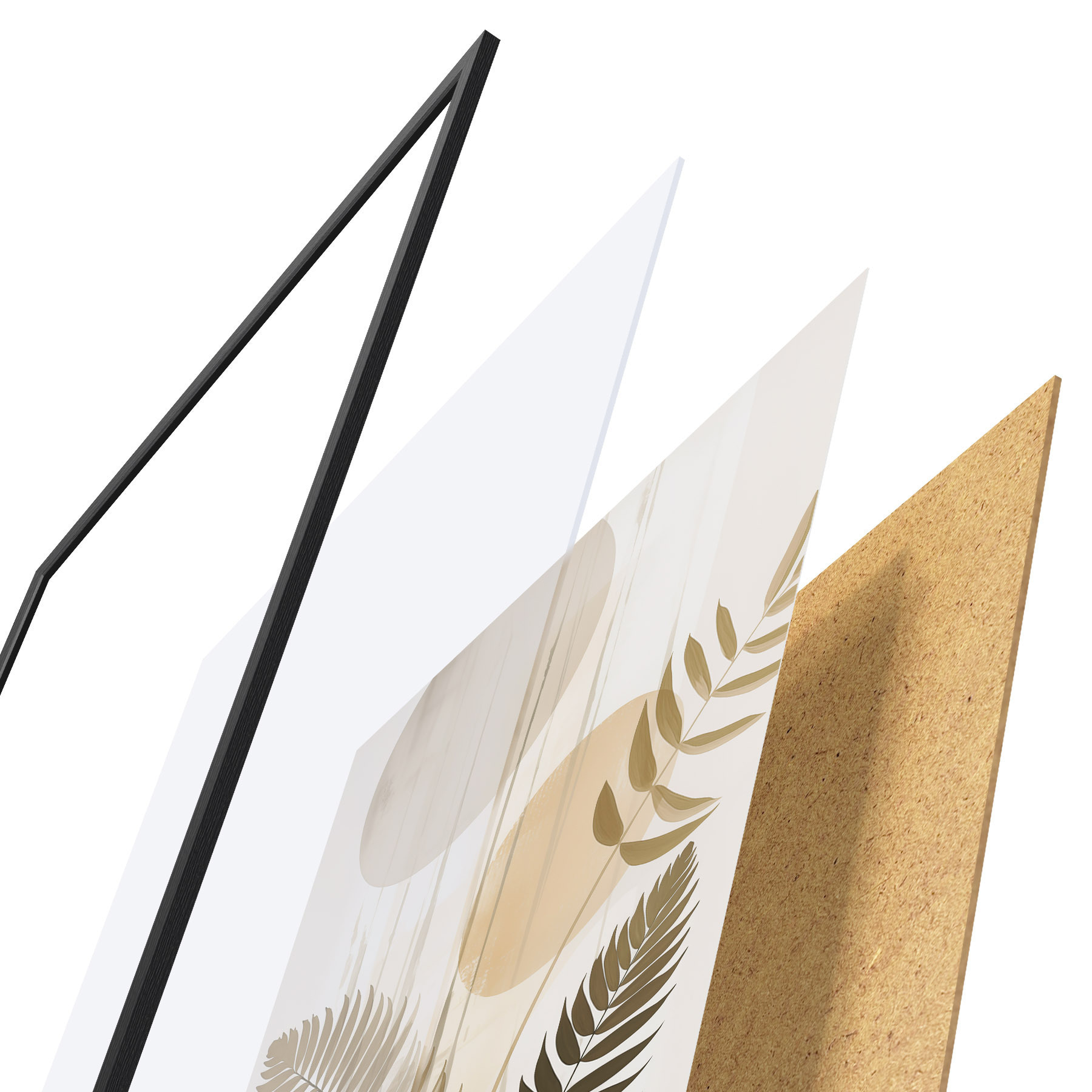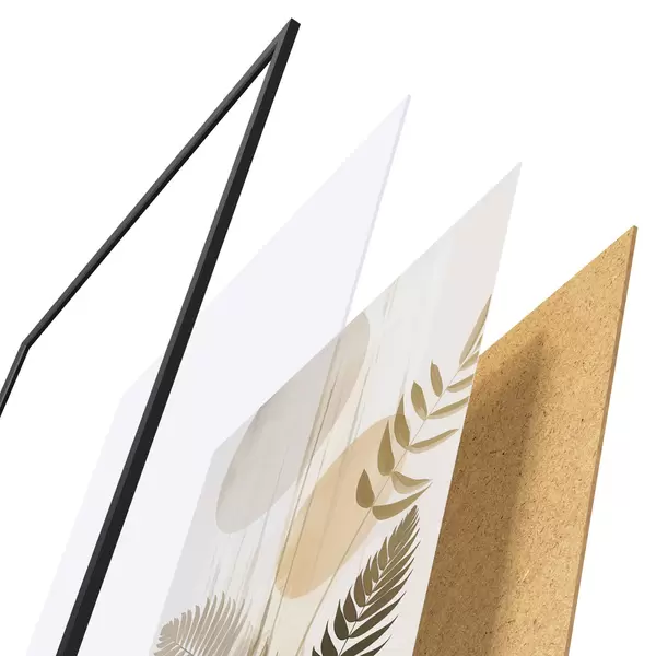 Plagát sa skladá z rámu, plexiskla, vytlačeného obrazu a podkladu z drevotriesky. Plagát možno okamžite zavesiť na stenu vďaka úchytom na zadnej strane.