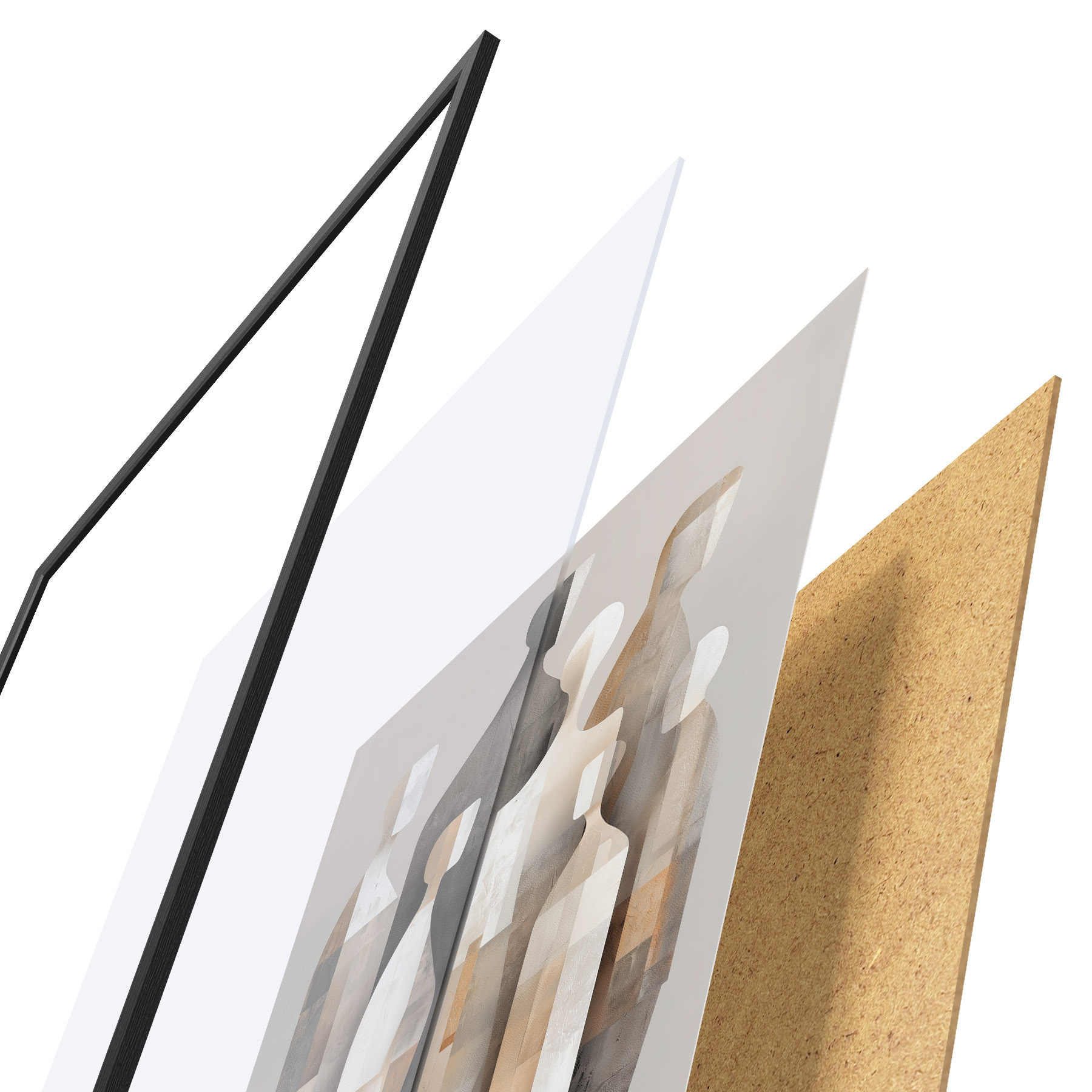 Plagát sa skladá z rámu, plexiskla, vytlačeného obrazu a podkladu z drevotriesky. Plagát možno okamžite zavesiť na stenu vďaka úchytom na zadnej strane.