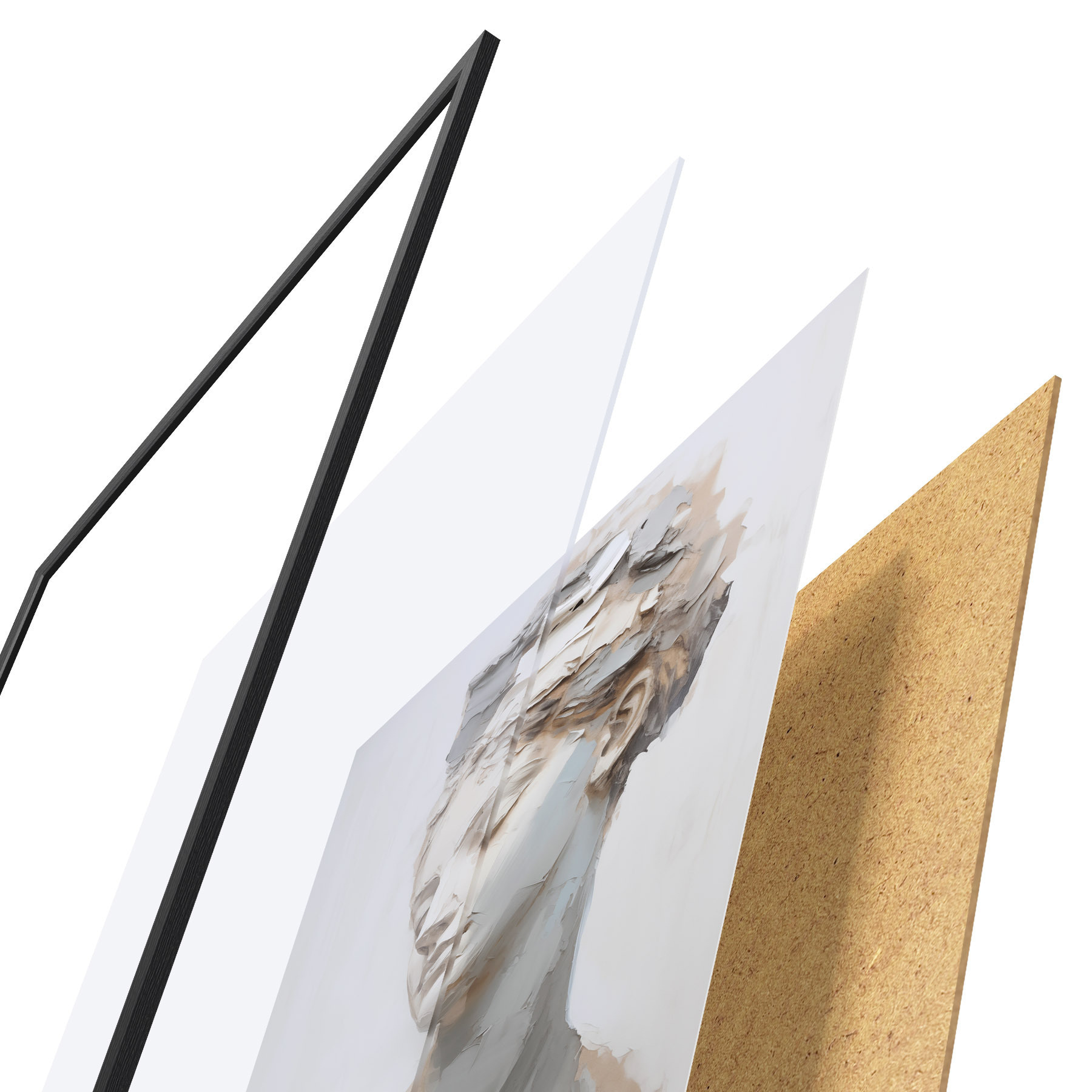 Plagát sa skladá z rámu, plexiskla, vytlačeného obrazu a podkladu z drevotriesky. Plagát možno okamžite zavesiť na stenu vďaka úchytom na zadnej strane.