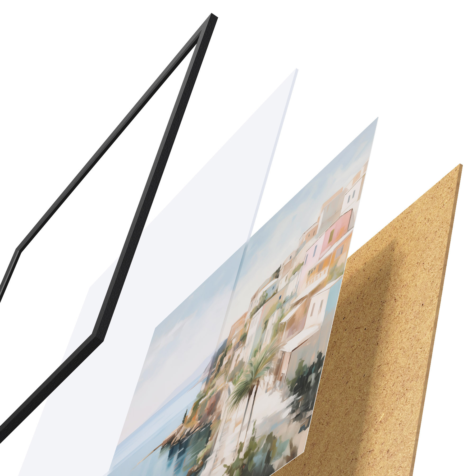 Plagát sa skladá z rámu, plexiskla, vytlačeného obrazu a podkladu z drevotriesky. Plagát možno okamžite zavesiť na stenu vďaka úchytom na zadnej strane.