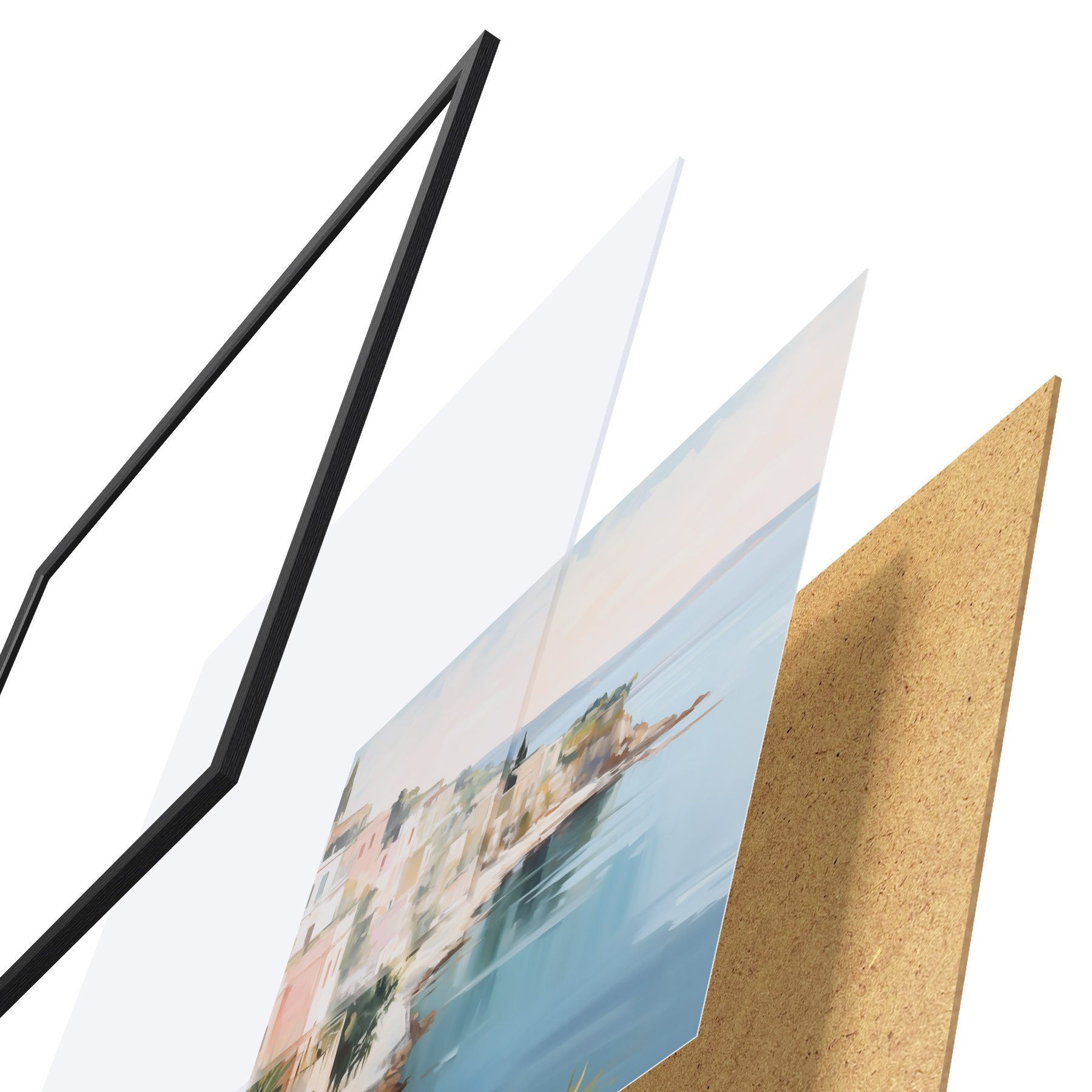 Plagát sa skladá z rámu, plexiskla, vytlačeného obrazu a podkladu z drevotriesky. Plagát možno okamžite zavesiť na stenu vďaka úchytom na zadnej strane.