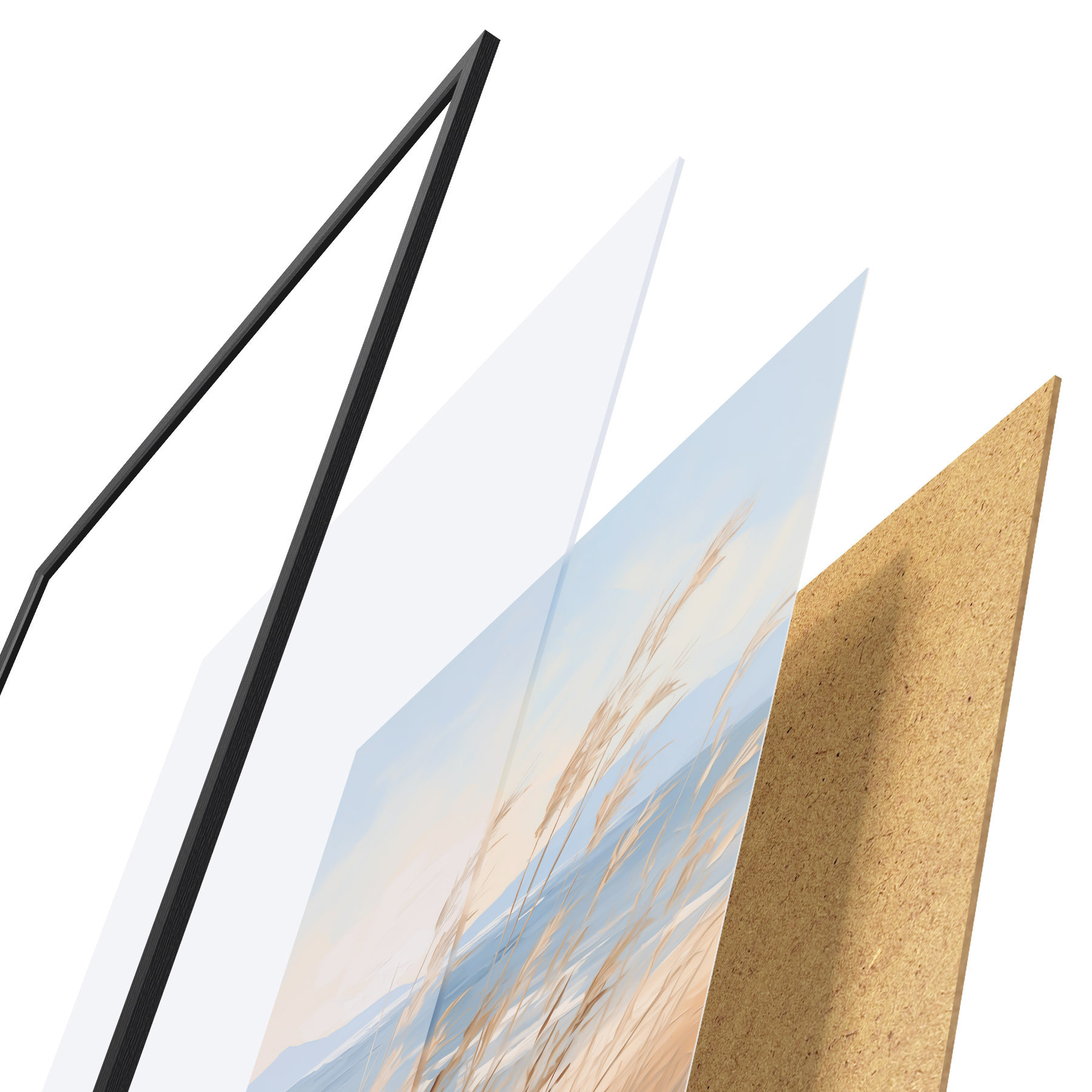 Plagát sa skladá z rámu, plexiskla, vytlačeného obrazu a podkladu z drevotriesky. Plagát možno okamžite zavesiť na stenu vďaka úchytom na zadnej strane.