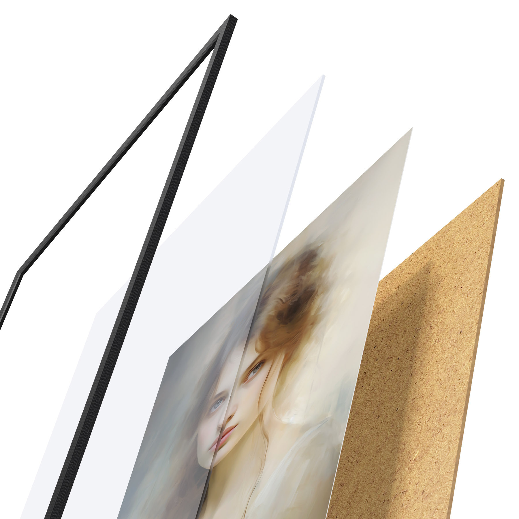 Plagát sa skladá z rámu, plexiskla, vytlačeného obrazu a podkladu z drevotriesky. Plagát možno okamžite zavesiť na stenu vďaka úchytom na zadnej strane.