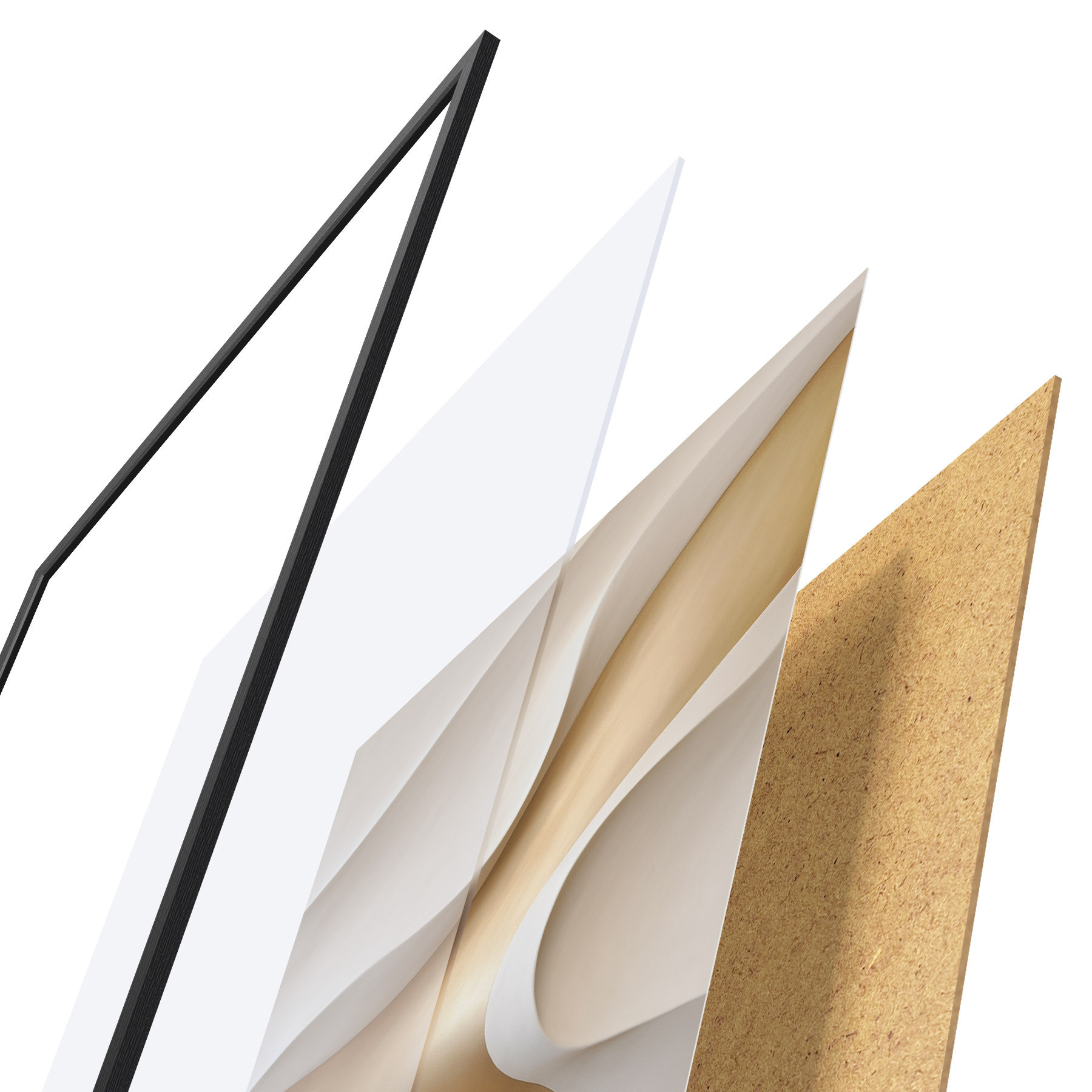 Plagát sa skladá z rámu, plexiskla, vytlačeného obrazu a podkladu z drevotriesky. Plagát možno okamžite zavesiť na stenu vďaka úchytom na zadnej strane.