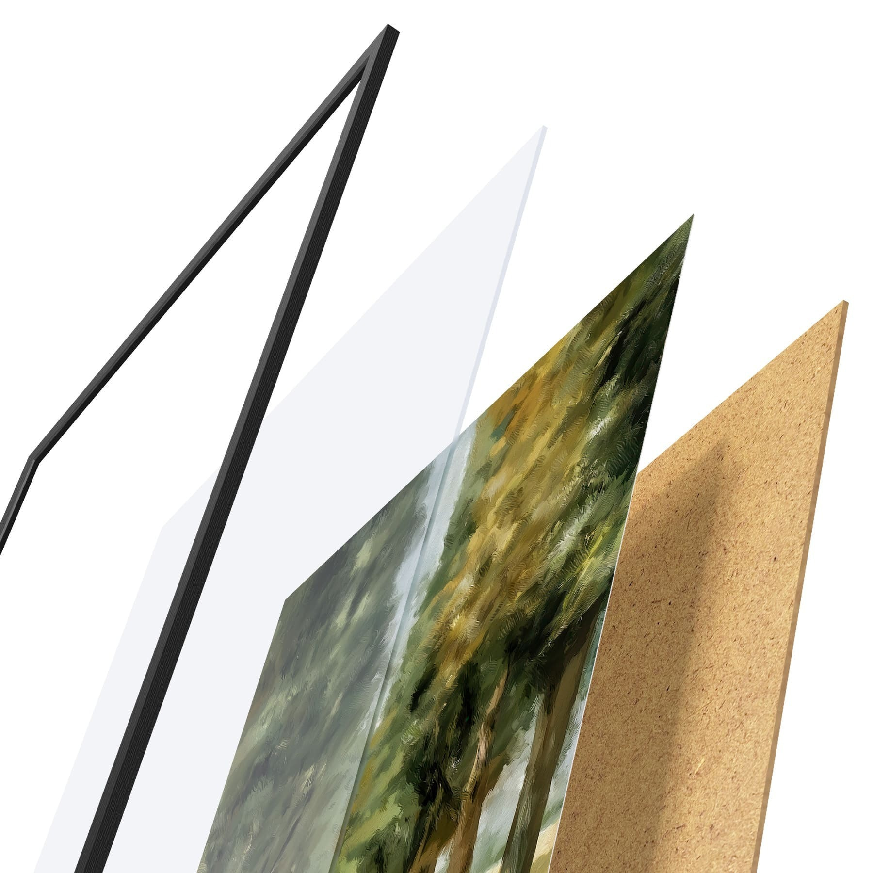 Plagát sa skladá z rámu, plexiskla, vytlačeného obrazu a podkladu z drevotriesky. Plagát možno okamžite zavesiť na stenu vďaka úchytom na zadnej strane.