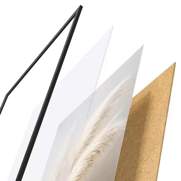Plagát sa skladá z rámu, plexiskla, vytlačeného obrazu a podkladu z drevotriesky. Plagát možno okamžite zavesiť na stenu vďaka úchytom na zadnej strane.