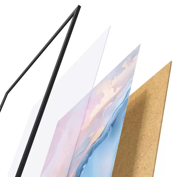 Plagát sa skladá z rámu, plexiskla, vytlačeného obrazu a podkladu z drevotriesky. Plagát možno okamžite zavesiť na stenu vďaka úchytom na zadnej strane.