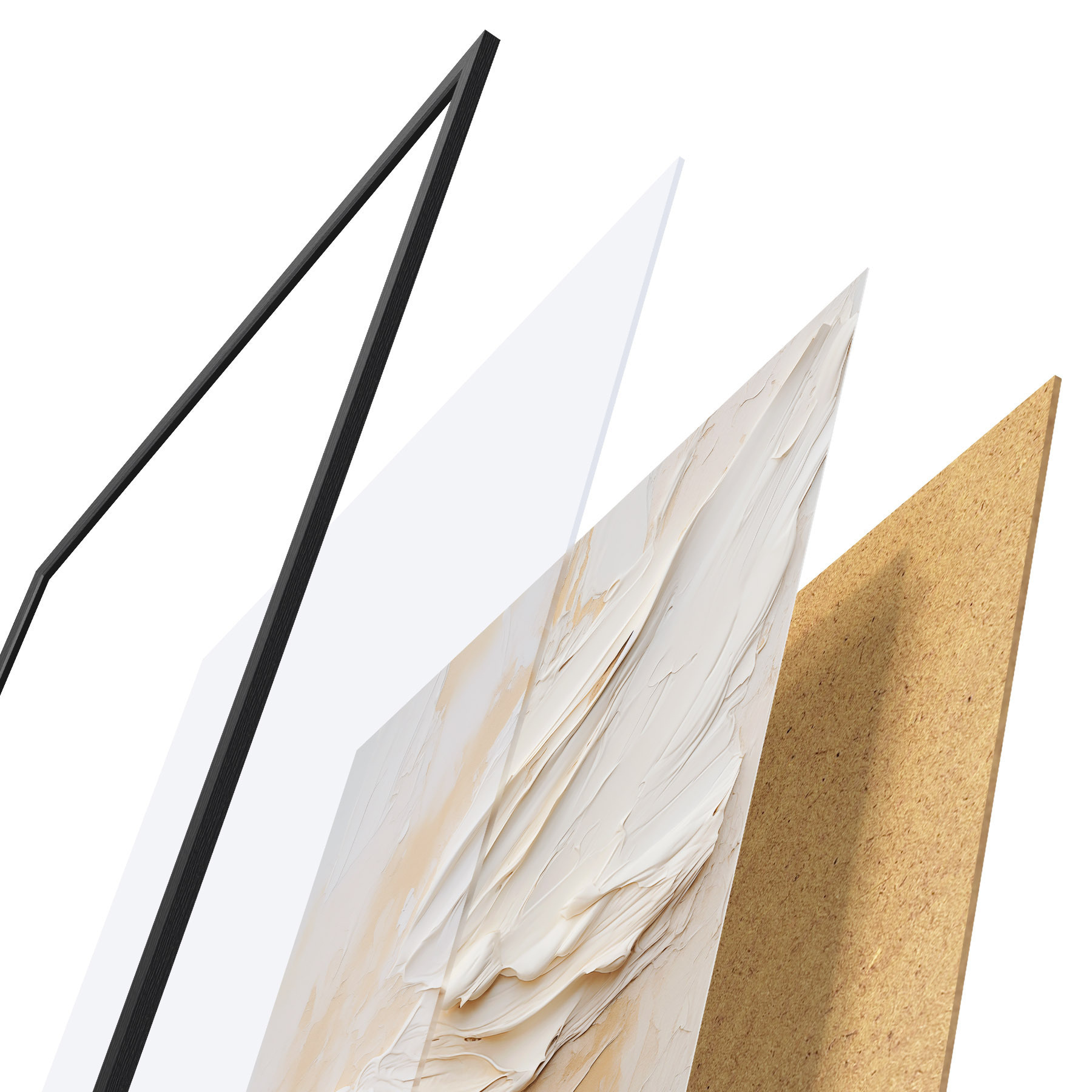 Plagát sa skladá z rámu, plexiskla, vytlačeného obrazu a podkladu z drevotriesky. Plagát možno okamžite zavesiť na stenu vďaka úchytom na zadnej strane.