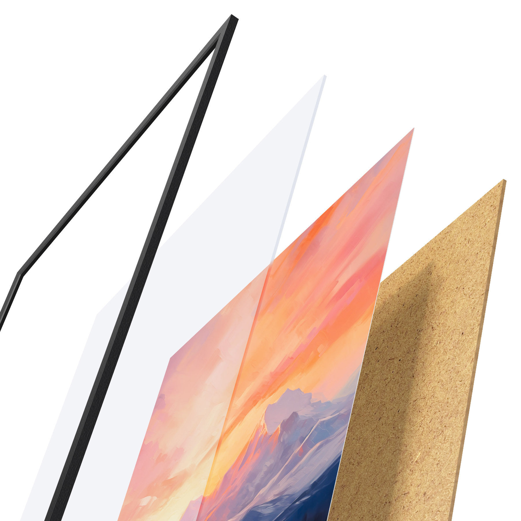 Plagát sa skladá z rámu, plexiskla, vytlačeného obrazu a podkladu z drevotriesky. Plagát možno okamžite zavesiť na stenu vďaka úchytom na zadnej strane.