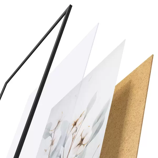 Plagát sa skladá z rámu, plexiskla, vytlačeného obrazu a podkladu z drevotriesky. Plagát možno okamžite zavesiť na stenu vďaka úchytom na zadnej strane.