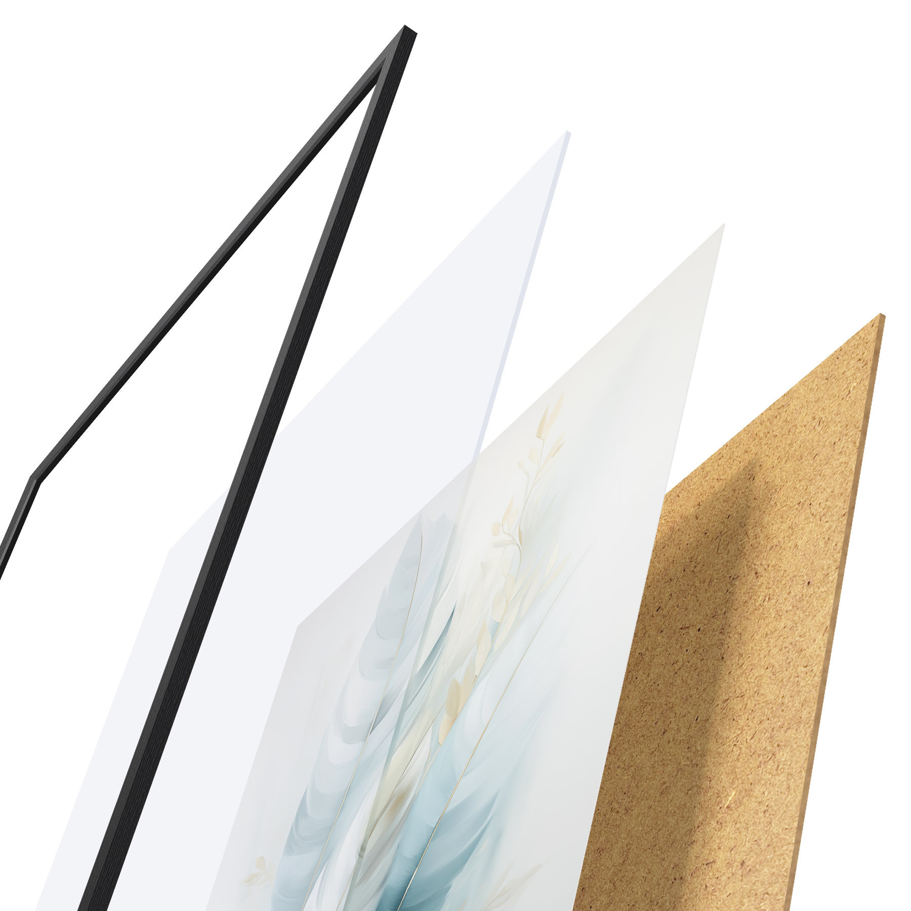 Plagát sa skladá z rámu, plexiskla, vytlačeného obrazu a podkladu z drevotriesky. Plagát možno okamžite zavesiť na stenu vďaka úchytom na zadnej strane.