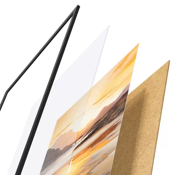Plagát sa skladá z rámu, plexiskla, vytlačeného obrazu a podkladu z drevotriesky. Plagát možno okamžite zavesiť na stenu vďaka úchytom na zadnej strane.