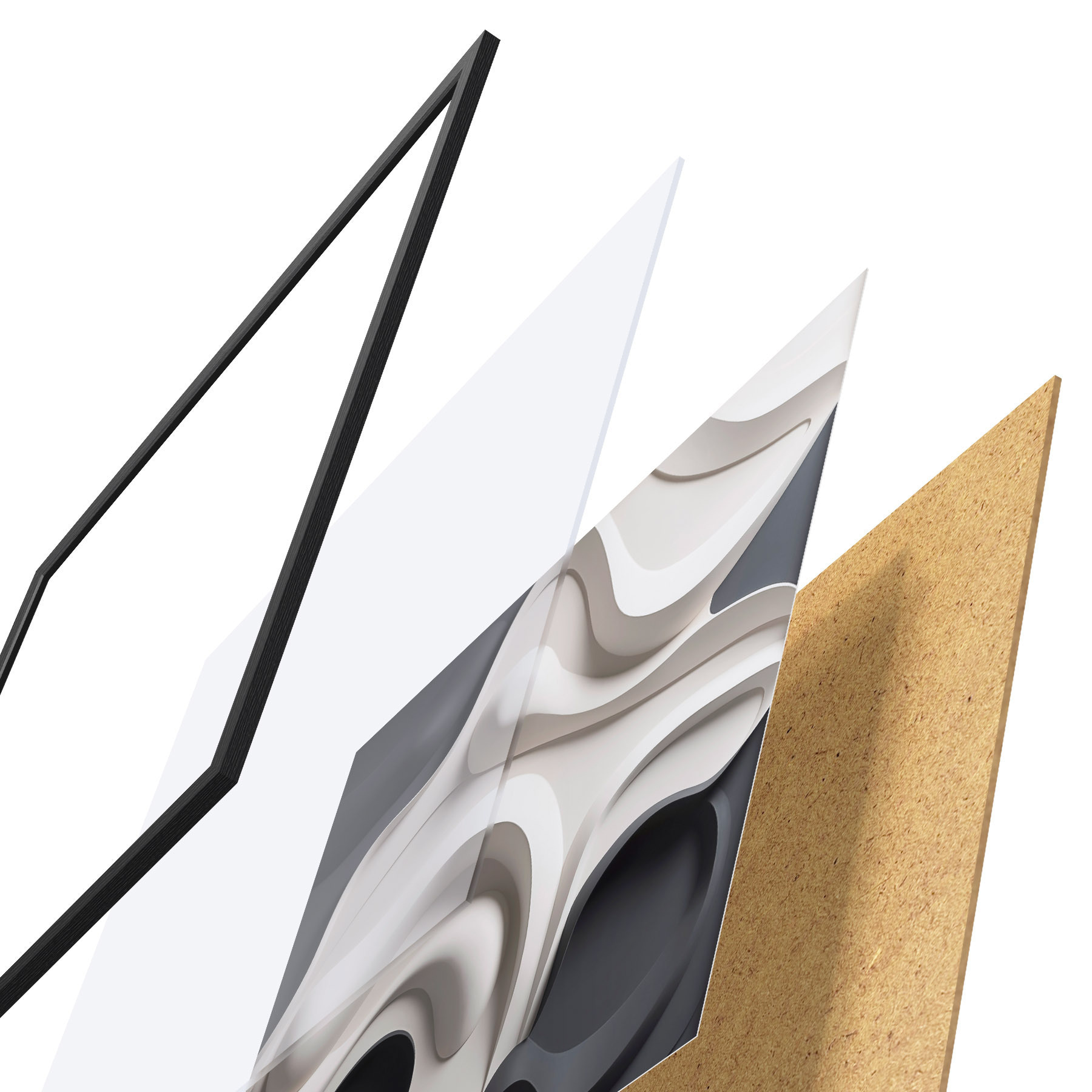 Plagát sa skladá z rámu, plexiskla, vytlačeného obrazu a podkladu z drevotriesky. Plagát možno okamžite zavesiť na stenu vďaka úchytom na zadnej strane.