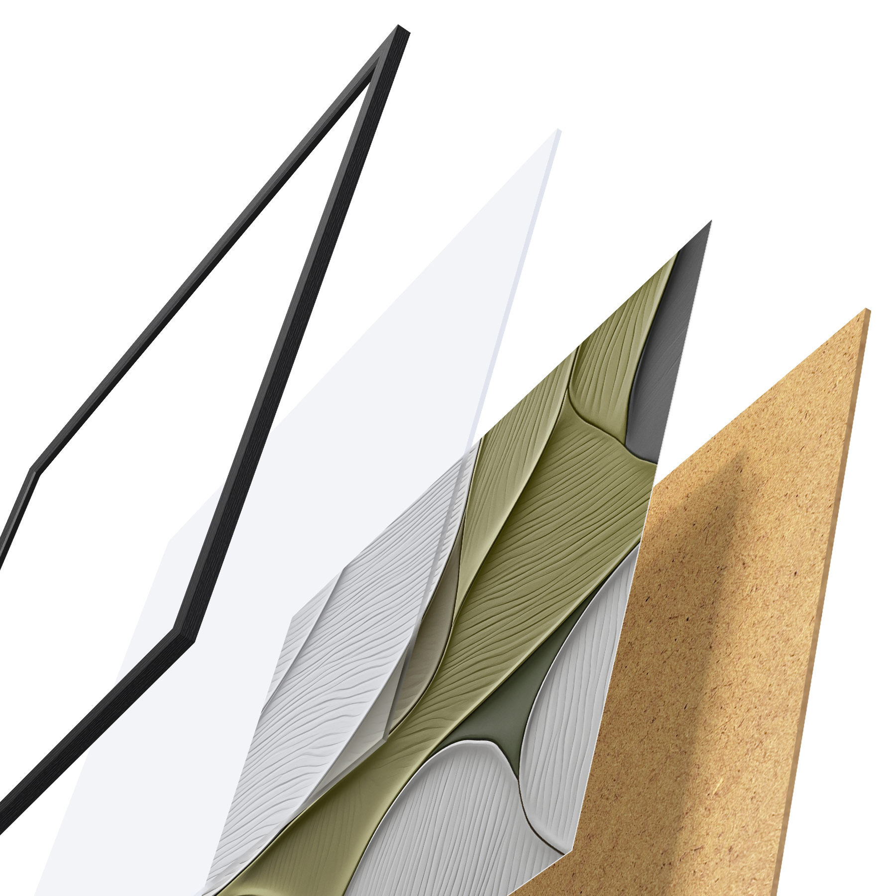 Plagát sa skladá z rámu, plexiskla, vytlačeného obrazu a podkladu z drevotriesky. Plagát možno okamžite zavesiť na stenu vďaka úchytom na zadnej strane.