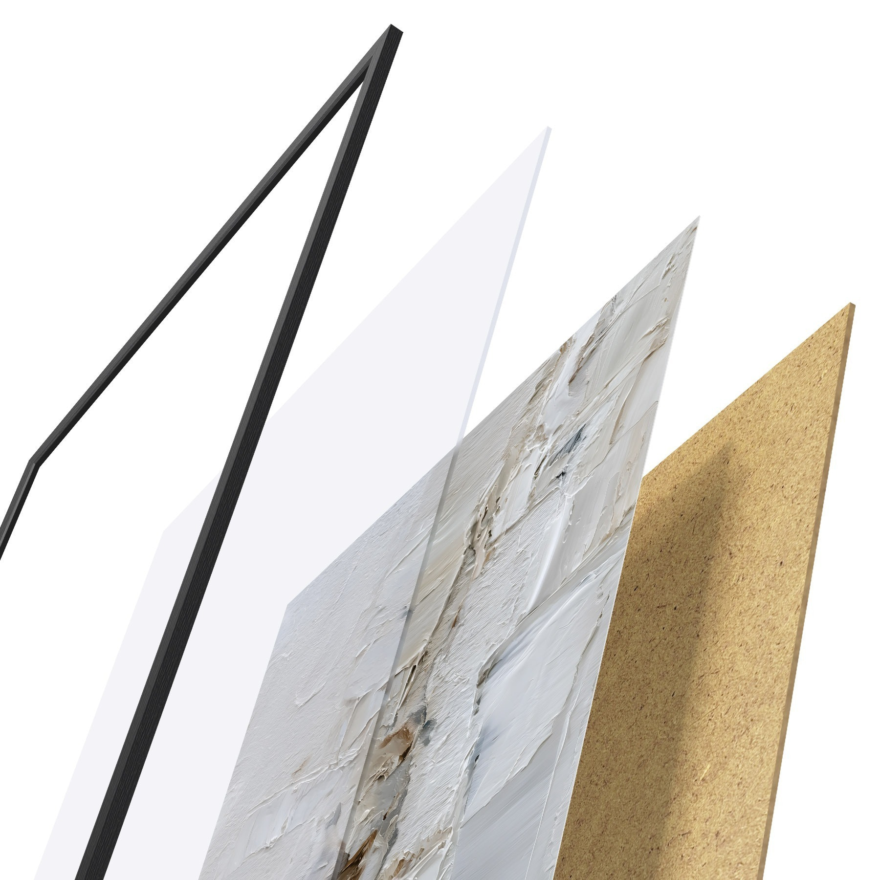 Plagát sa skladá z rámu, plexiskla, vytlačeného obrazu a podkladu z drevotriesky. Plagát možno okamžite zavesiť na stenu vďaka úchytom na zadnej strane.