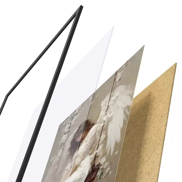 Plagát sa skladá z rámu, plexiskla, vytlačeného obrazu a podkladu z drevotriesky. Plagát možno okamžite zavesiť na stenu vďaka úchytom na zadnej strane.