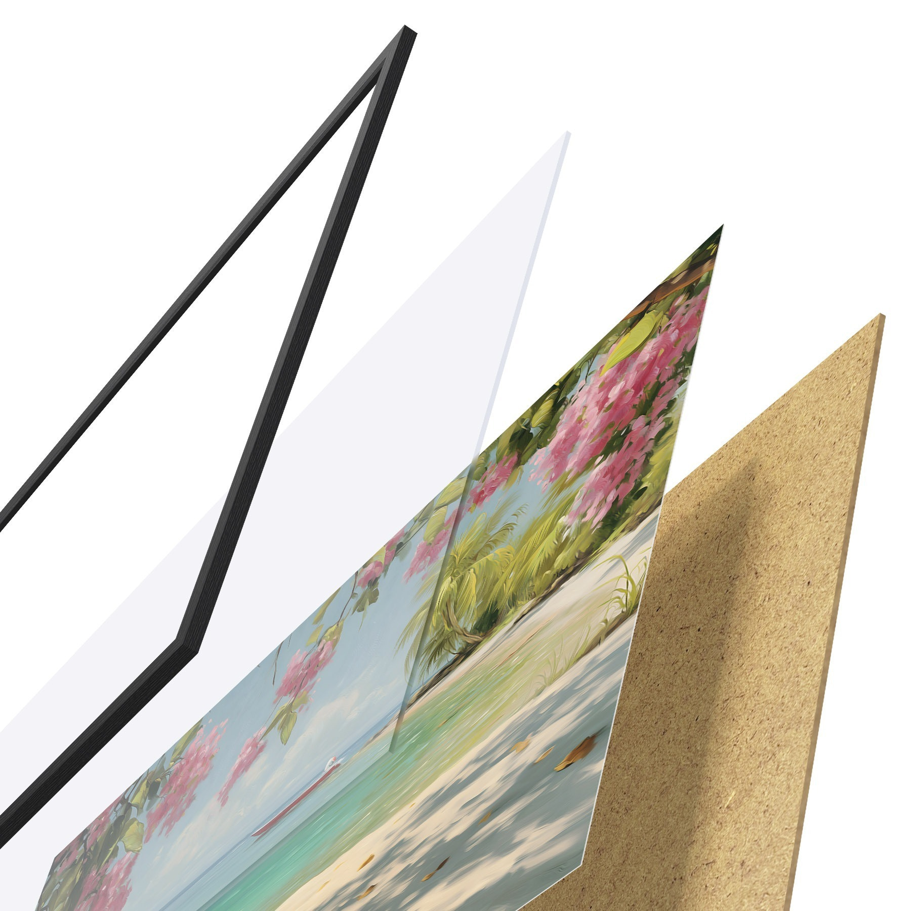 Plagát sa skladá z rámu, plexiskla, vytlačeného obrazu a podkladu z drevotriesky. Plagát možno okamžite zavesiť na stenu vďaka úchytom na zadnej strane.