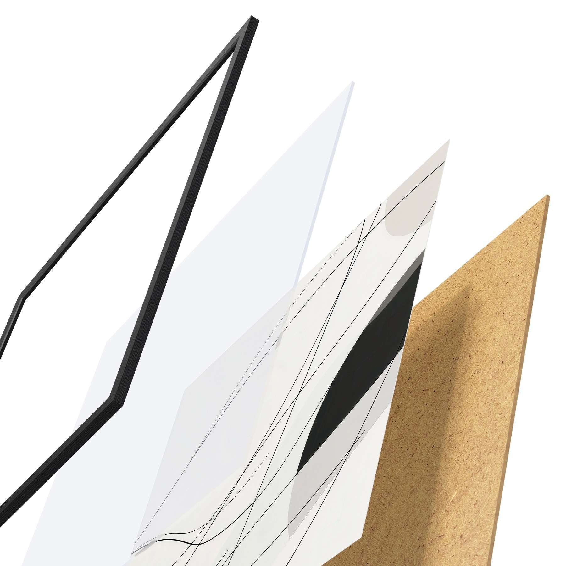 Plagát sa skladá z rámu, plexiskla, vytlačeného obrazu a podkladu z drevotriesky. Plagát možno okamžite zavesiť na stenu vďaka úchytom na zadnej strane.