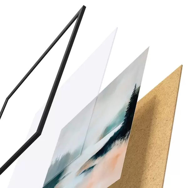 Plagát sa skladá z rámu, plexiskla, vytlačeného obrazu a podkladu z drevotriesky. Plagát možno okamžite zavesiť na stenu vďaka úchytom na zadnej strane.