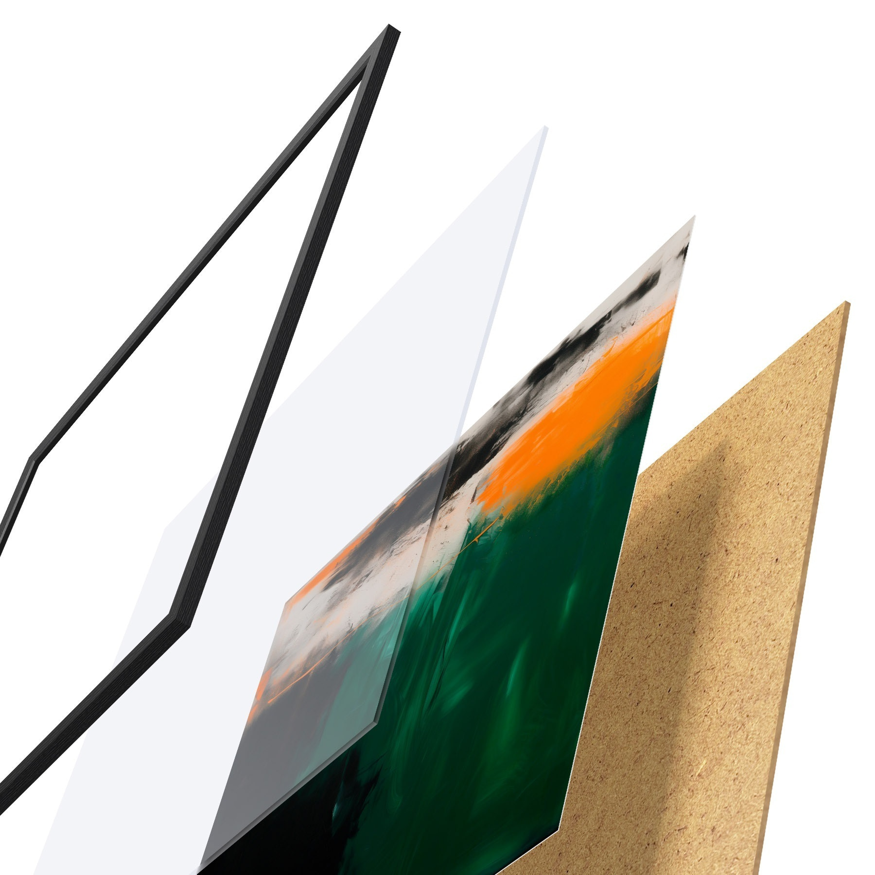 Plagát sa skladá z rámu, plexiskla, vytlačeného obrazu a podkladu z drevotriesky. Plagát možno okamžite zavesiť na stenu vďaka úchytom na zadnej strane.
