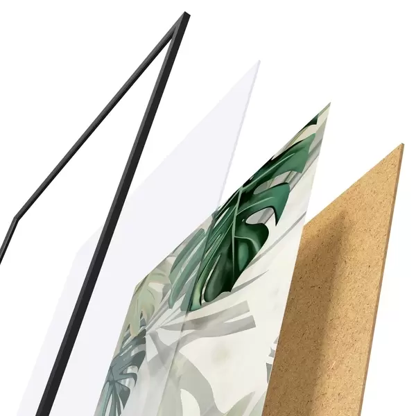 Plagát sa skladá z rámu, plexiskla, vytlačeného obrazu a podkladu z drevotriesky. Plagát možno okamžite zavesiť na stenu vďaka úchytom na zadnej strane.