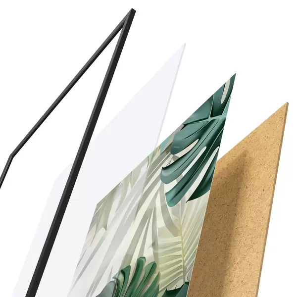 Plagát sa skladá z rámu, plexiskla, vytlačeného obrazu a podkladu z drevotriesky. Plagát možno okamžite zavesiť na stenu vďaka úchytom na zadnej strane.