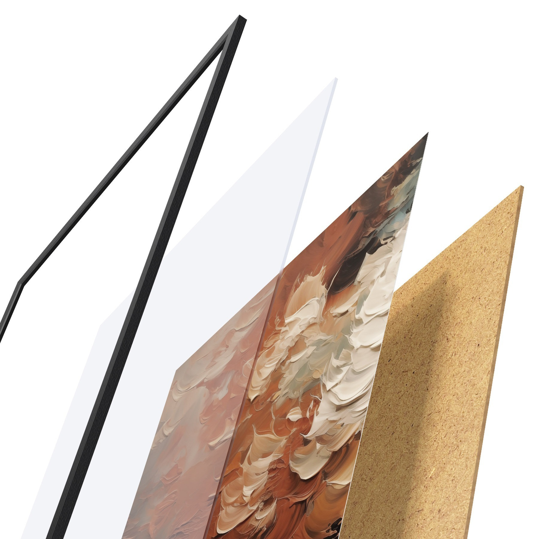 Plagát sa skladá z rámu, plexiskla, vytlačeného obrazu a podkladu z drevotriesky. Plagát možno okamžite zavesiť na stenu vďaka úchytom na zadnej strane.