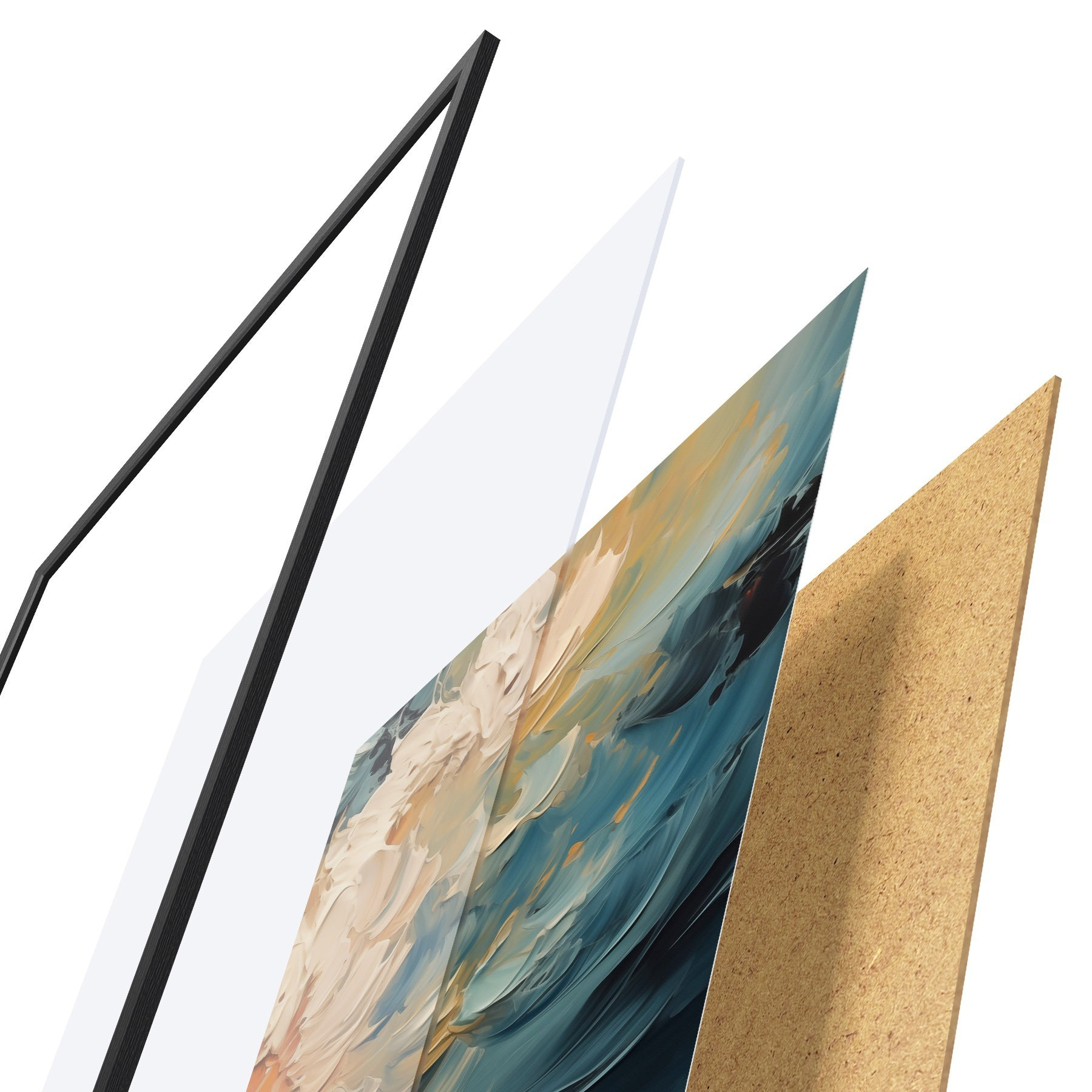 Plagát sa skladá z rámu, plexiskla, vytlačeného obrazu a podkladu z drevotriesky. Plagát možno okamžite zavesiť na stenu vďaka úchytom na zadnej strane.