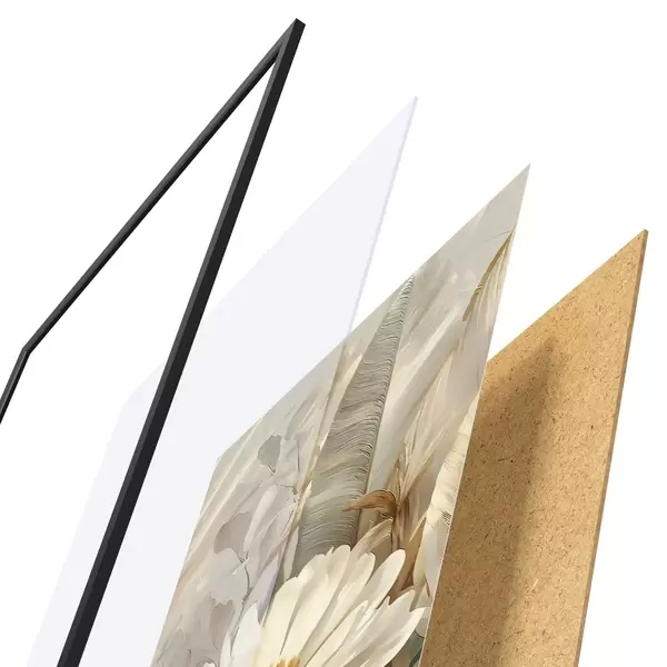 Plagát sa skladá z rámu, plexiskla, vytlačeného obrazu a podkladu z drevotriesky. Plagát možno okamžite zavesiť na stenu vďaka úchytom na zadnej strane.
