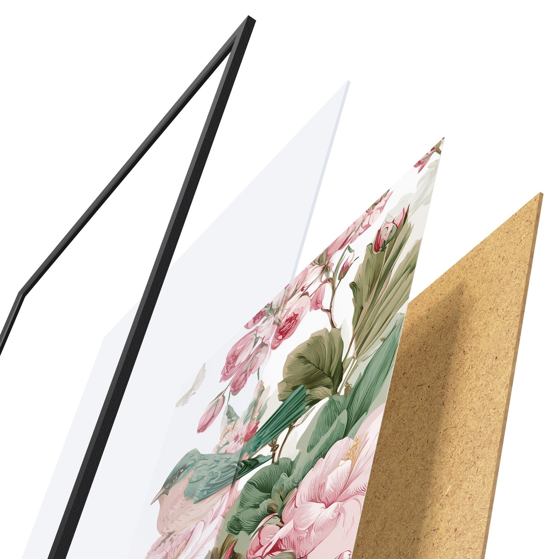 Plagát sa skladá z rámu, plexiskla, vytlačeného obrazu a podkladu z drevotriesky. Plagát možno okamžite zavesiť na stenu vďaka úchytom na zadnej strane.