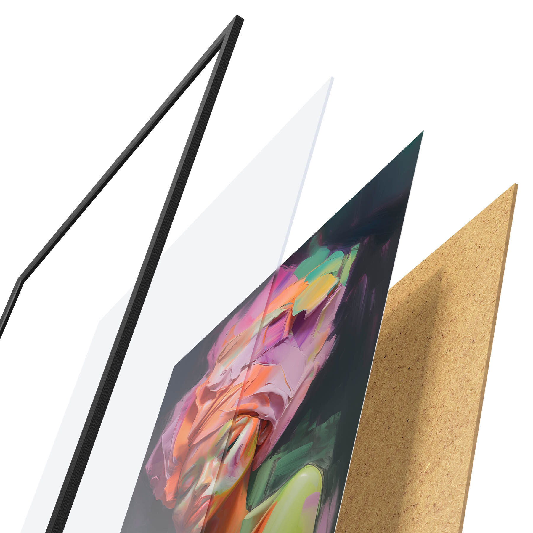 Plagát sa skladá z rámu, plexiskla, vytlačeného obrazu a podkladu z drevotriesky. Plagát možno okamžite zavesiť na stenu vďaka úchytom na zadnej strane.