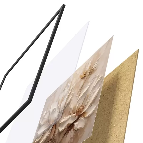 Plagát sa skladá z rámu, plexiskla, vytlačeného obrazu a podkladu z drevotriesky. Plagát možno okamžite zavesiť na stenu vďaka úchytom na zadnej strane.