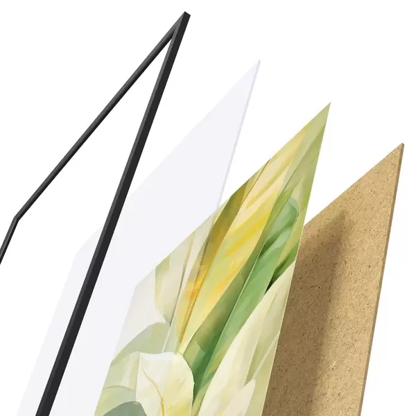 Plagát sa skladá z rámu, plexiskla, vytlačeného obrazu a podkladu z drevotriesky. Plagát možno okamžite zavesiť na stenu vďaka úchytom na zadnej strane.