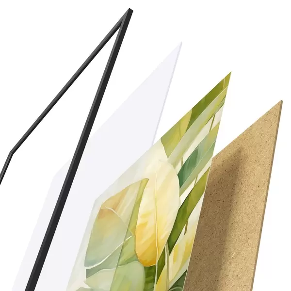 Plagát sa skladá z rámu, plexiskla, vytlačeného obrazu a podkladu z drevotriesky. Plagát možno okamžite zavesiť na stenu vďaka úchytom na zadnej strane.