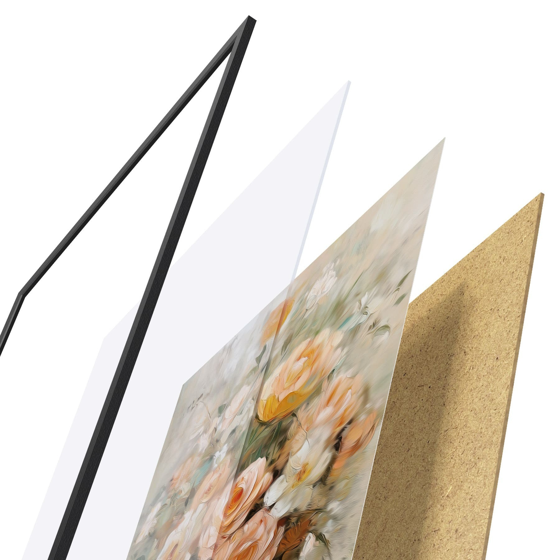 Plagát sa skladá z rámu, plexiskla, vytlačeného obrazu a podkladu z drevotriesky. Plagát možno okamžite zavesiť na stenu vďaka úchytom na zadnej strane.