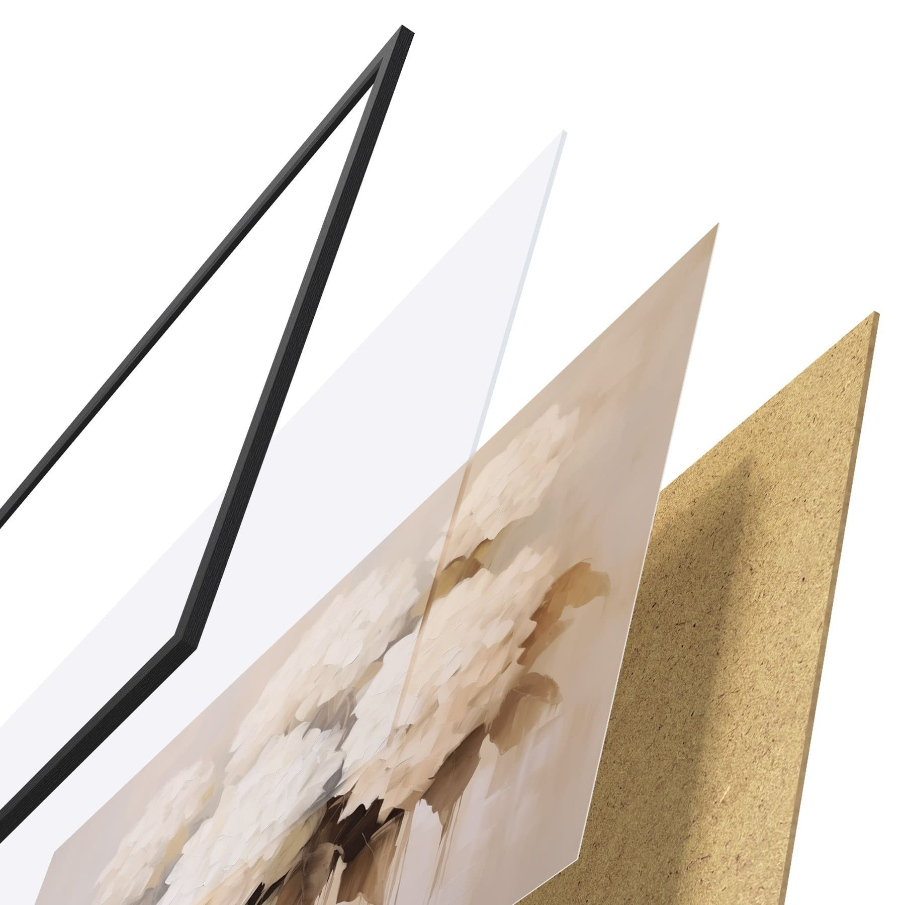 Plagát sa skladá z rámu, plexiskla, vytlačeného obrazu a podkladu z drevotriesky. Plagát možno okamžite zavesiť na stenu vďaka úchytom na zadnej strane.