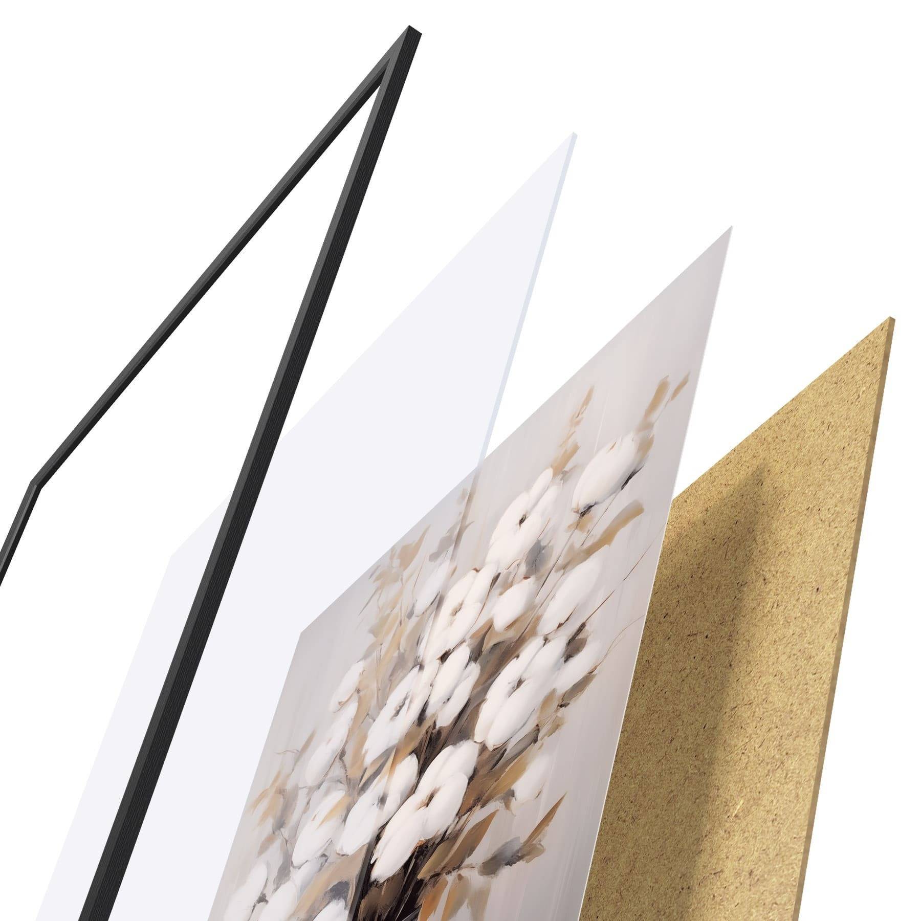 Plagát sa skladá z rámu, plexiskla, vytlačeného obrazu a podkladu z drevotriesky. Plagát možno okamžite zavesiť na stenu vďaka úchytom na zadnej strane.