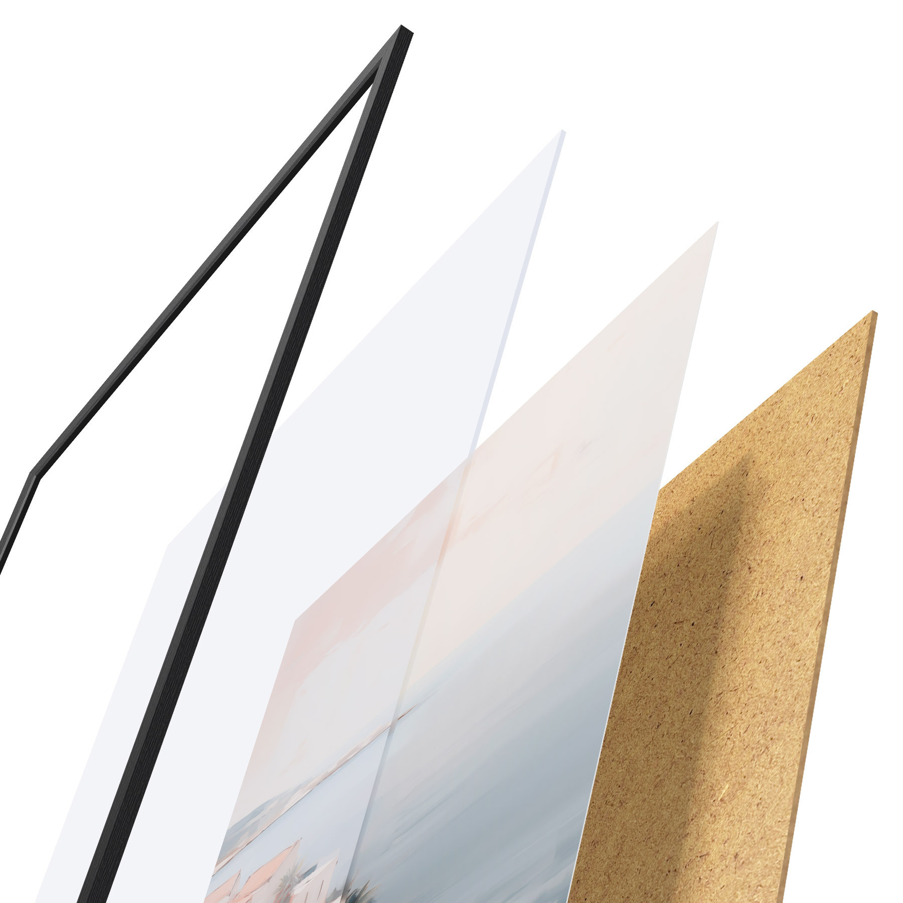 Plagát sa skladá z rámu, plexiskla, vytlačeného obrazu a podkladu z drevotriesky. Plagát možno okamžite zavesiť na stenu vďaka úchytom na zadnej strane.