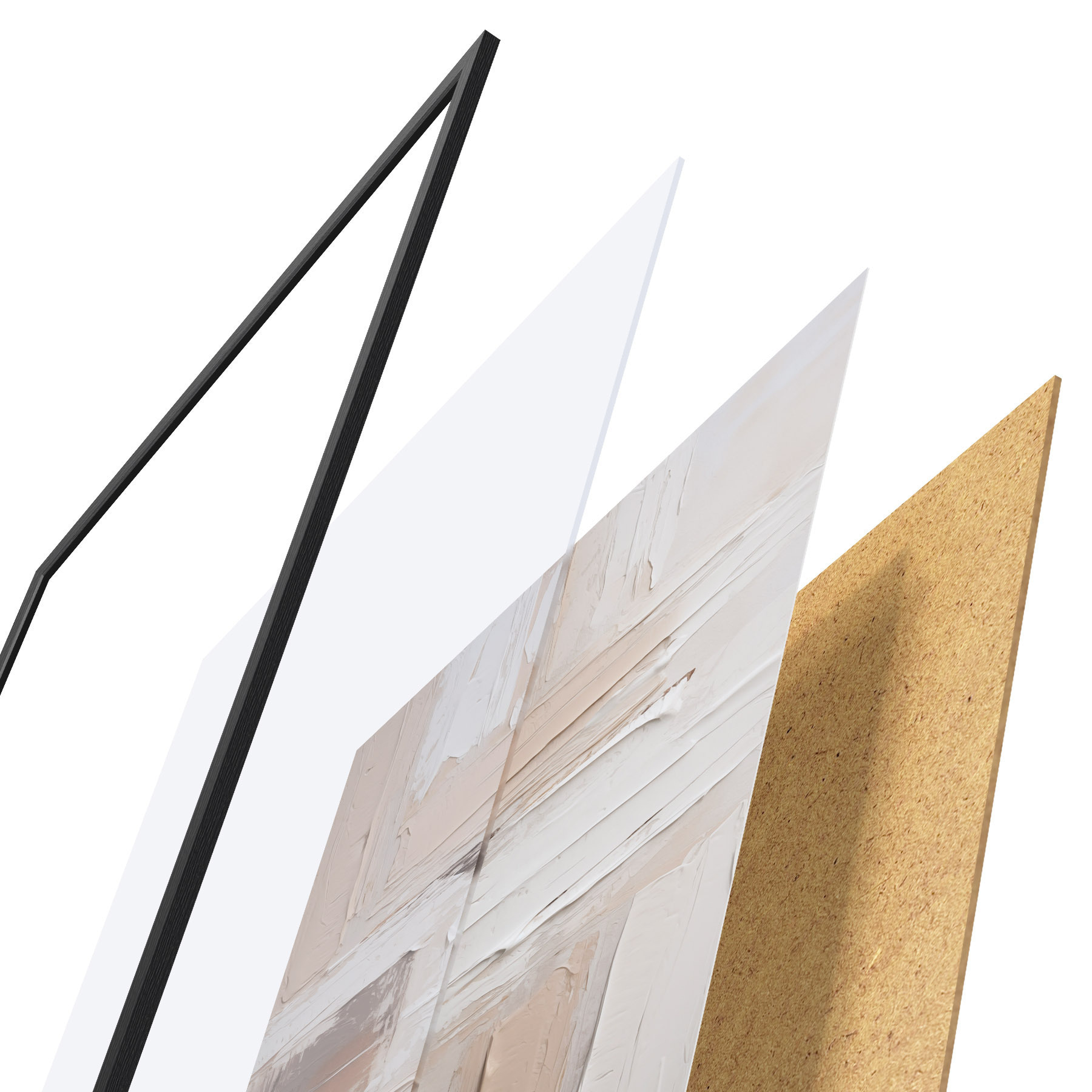 Plagát sa skladá z rámu, plexiskla, vytlačeného obrazu a podkladu z drevotriesky. Plagát možno okamžite zavesiť na stenu vďaka úchytom na zadnej strane.