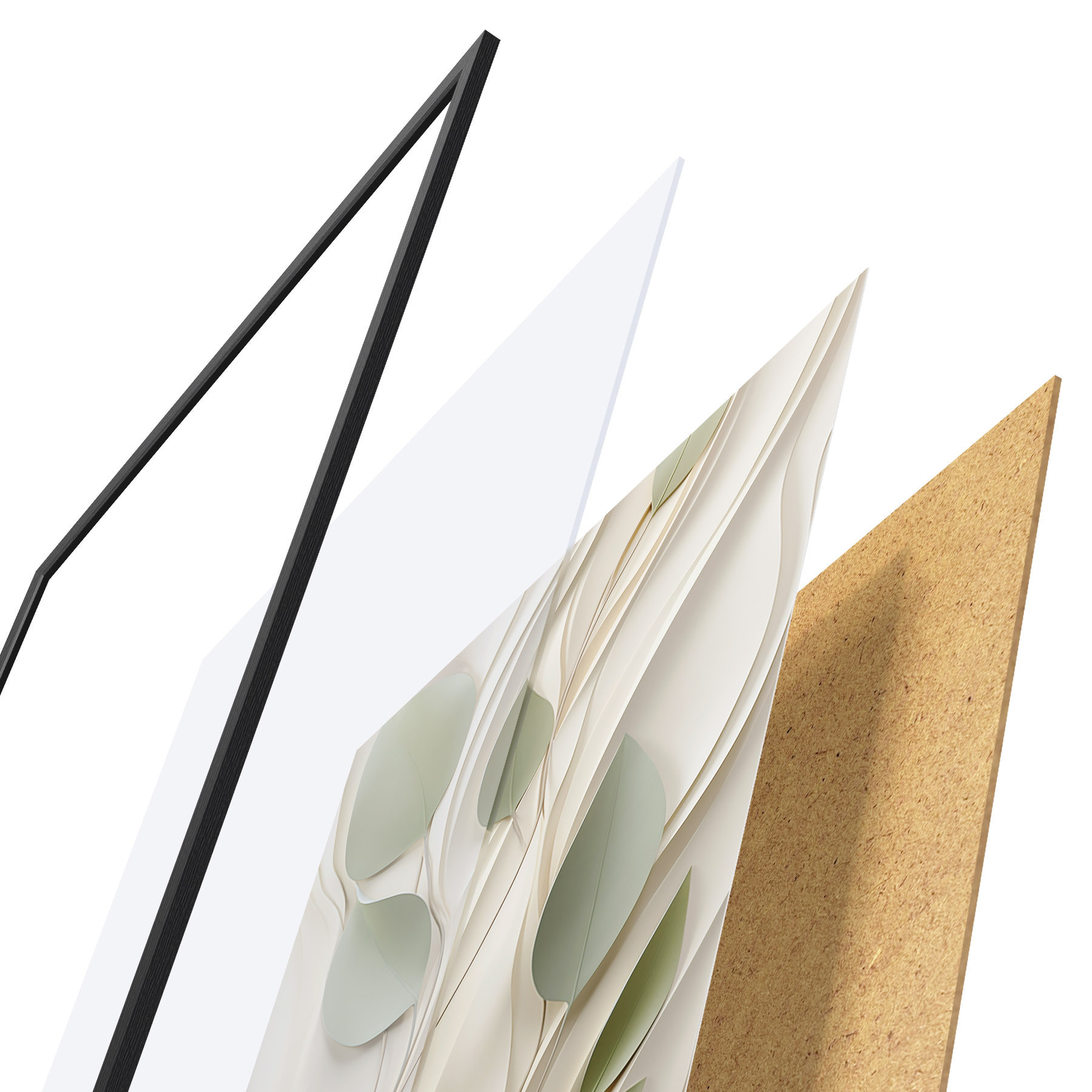 Plagát sa skladá z rámu, plexiskla, vytlačeného obrazu a podkladu z drevotriesky. Plagát možno okamžite zavesiť na stenu vďaka úchytom na zadnej strane.