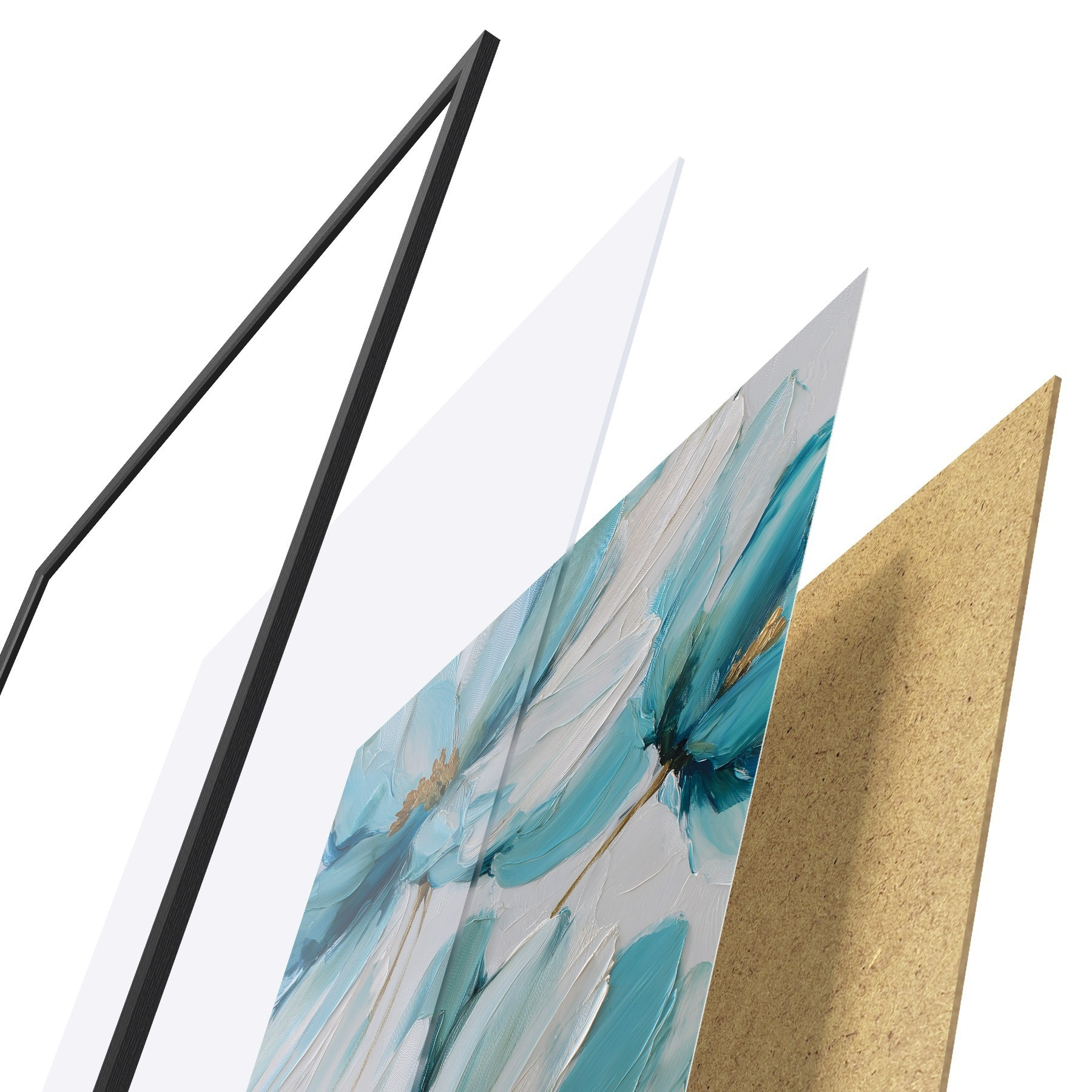 Plagát sa skladá z rámu, plexiskla, vytlačeného obrazu a podkladu z drevotriesky. Plagát možno okamžite zavesiť na stenu vďaka úchytom na zadnej strane.