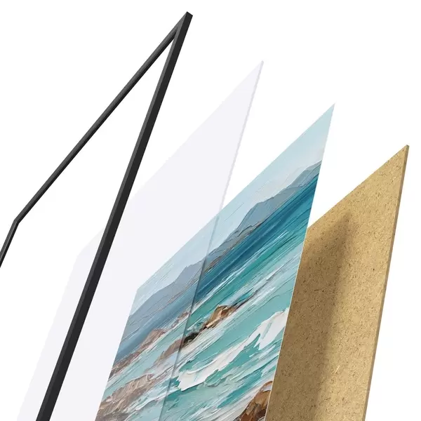 Plagát sa skladá z rámu, plexiskla, vytlačeného obrazu a podkladu z drevotriesky. Plagát možno okamžite zavesiť na stenu vďaka úchytom na zadnej strane.