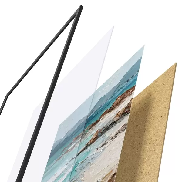 Plagát sa skladá z rámu, plexiskla, vytlačeného obrazu a podkladu z drevotriesky. Plagát možno okamžite zavesiť na stenu vďaka úchytom na zadnej strane.