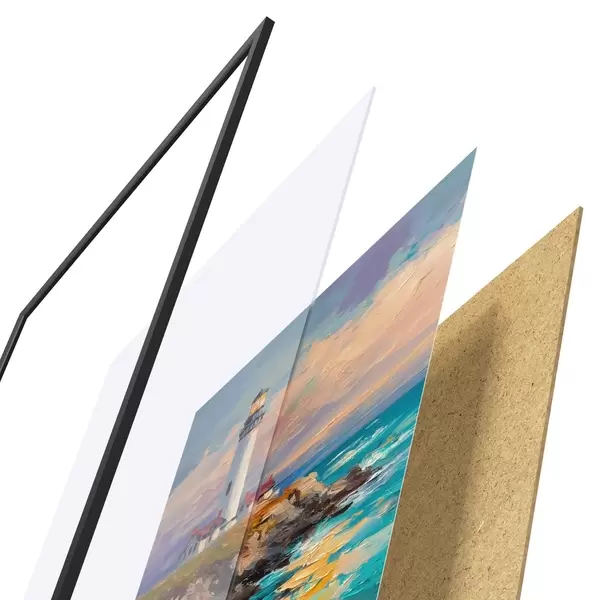 Plagát sa skladá z rámu, plexiskla, vytlačeného obrazu a podkladu z drevotriesky. Plagát možno okamžite zavesiť na stenu vďaka úchytom na zadnej strane.