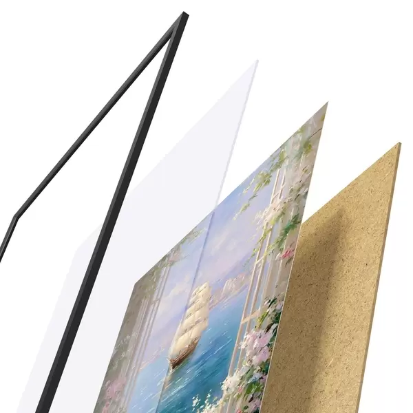 Plagát sa skladá z rámu, plexiskla, vytlačeného obrazu a podkladu z drevotriesky. Plagát možno okamžite zavesiť na stenu vďaka úchytom na zadnej strane.