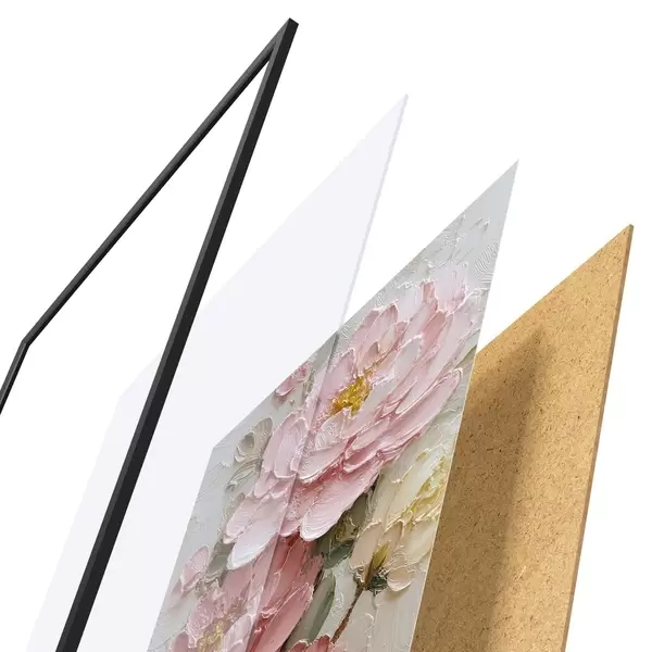 Plagát sa skladá z rámu, plexiskla, vytlačeného obrazu a podkladu z drevotriesky. Plagát možno okamžite zavesiť na stenu vďaka úchytom na zadnej strane.