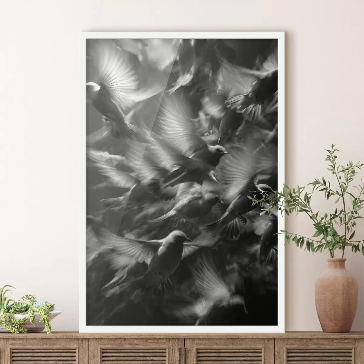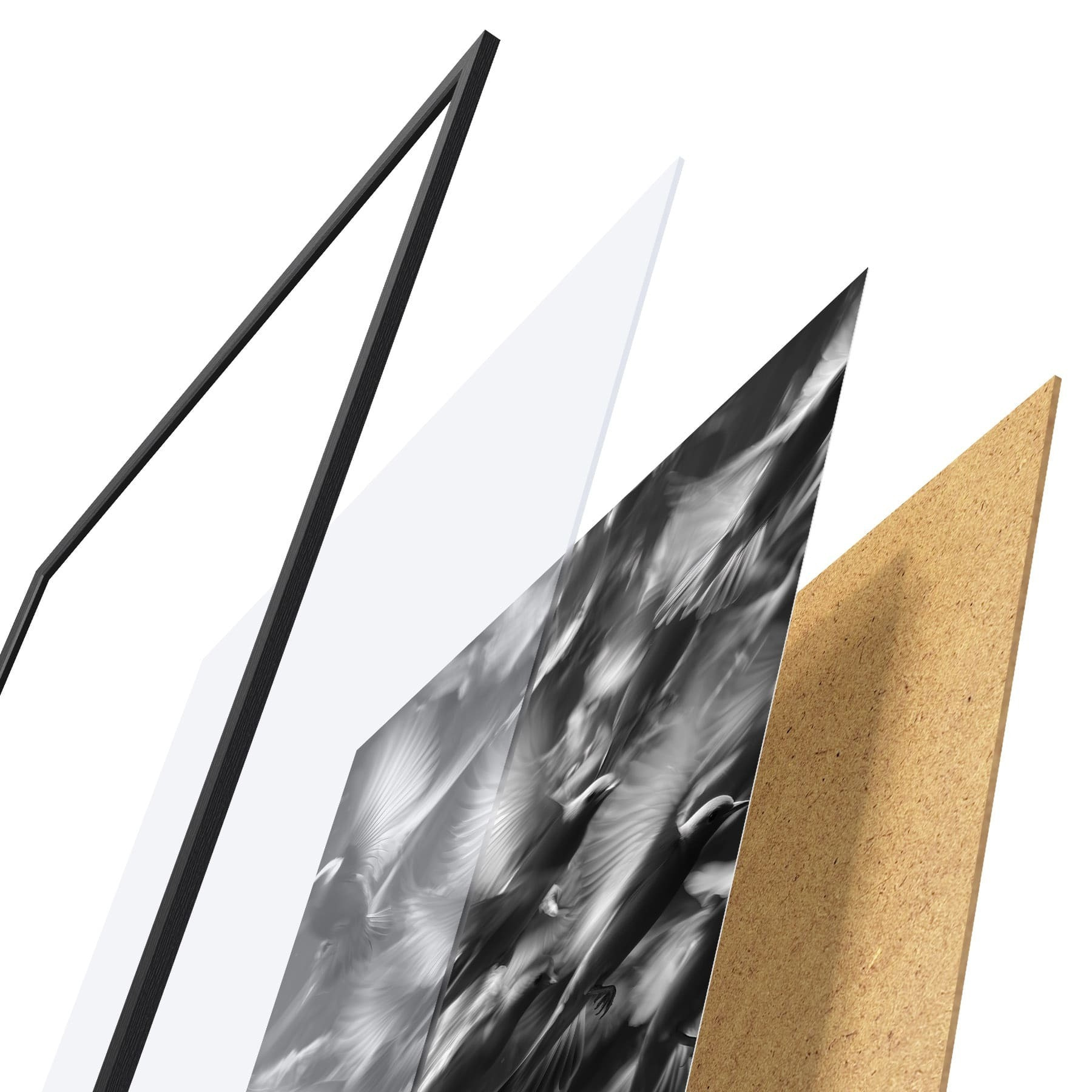Plagát sa skladá z rámu, plexiskla, vytlačeného obrazu a podkladu z drevotriesky. Plagát možno okamžite zavesiť na stenu vďaka úchytom na zadnej strane.