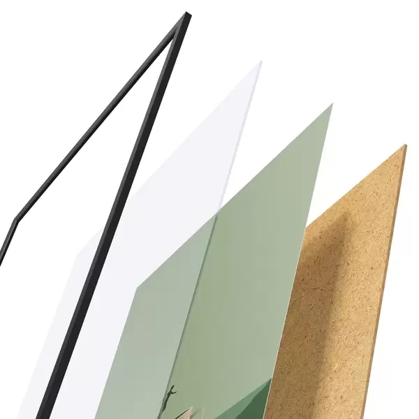 Plagát sa skladá z rámu, plexiskla, vytlačeného obrazu a podkladu z drevotriesky. Plagát možno okamžite zavesiť na stenu vďaka úchytom na zadnej strane.